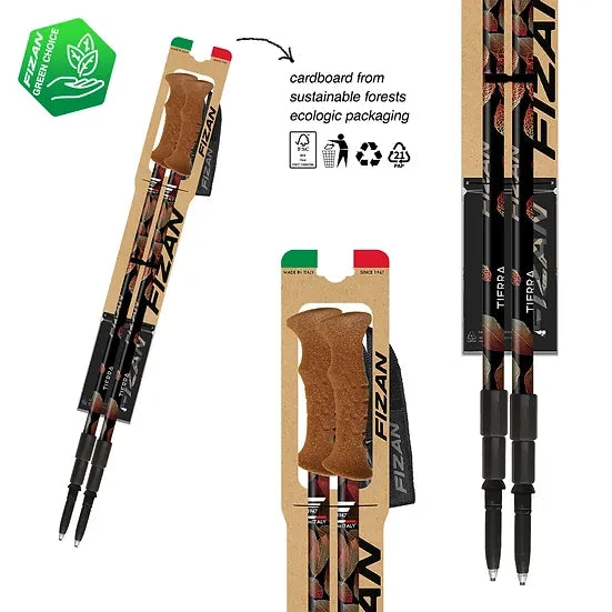 Tierra nūjas īpašā iezīme ir korķa rokturis, kas padara šo modeli unikālu savā klasē. Rokas siksna izgatavota no polipropilēna. Salocītā veidā garums ir tikai 63 cm, bet maksimāli izvilktā stāvoklī – 140 cm. Nūja sastāv no trim sekcijām (18/16/14 mm) un sver tikai 226 g. Grafika veidota ar sublimācijas tehniku, pievilcīgs krāsu pārejas efekts. Nūja ir regulējama ar Flexy sistēmu (ekspanderiem). Iepakojumā iekļautas 50 mm groziņi un uzgaļu aizsargvāciņi.