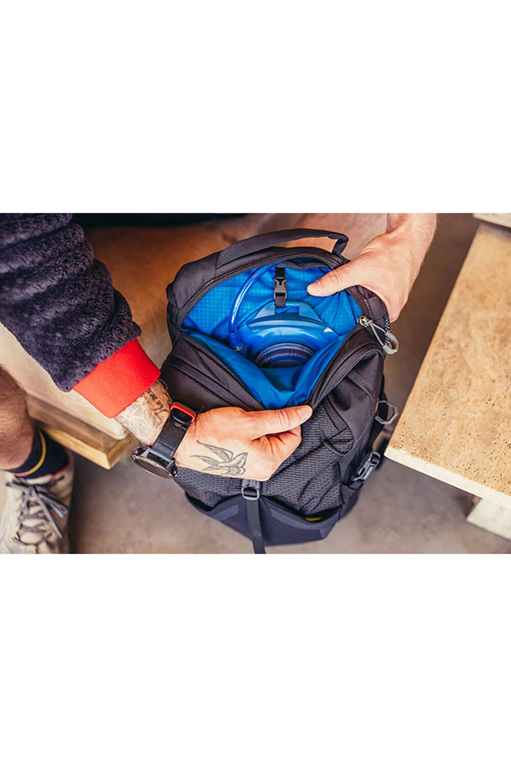 - Polsterētas, elpojošas airmesh plecu siksnas ar vienas rokas krūšu siksnas aizdari un hidrācijas stiprinājumiem