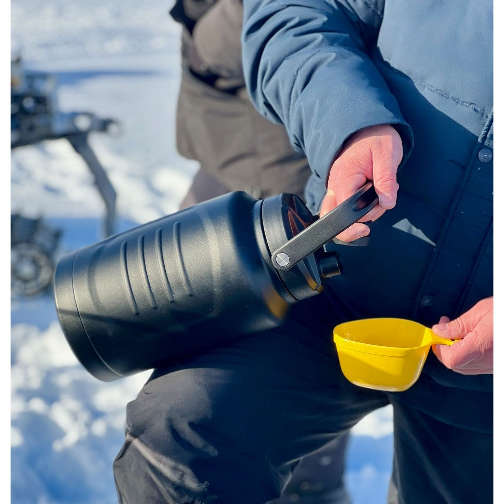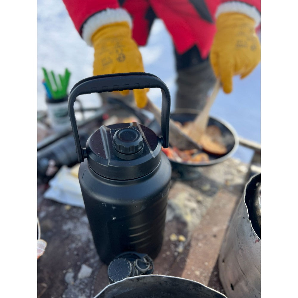 Ideāls kompanjons grupas pasākumos, transportēšanai, uzglabāšanai un jebkurā situācijā, kad nepieciešams lielāks ūdens, kafijas vai tējas tilpums, kas saglabājas karsts vai auksts vairākas stundas. Izturīgais Megajug (3,7 litri) ir izgatavots no īpaši izturīga, augstas kvalitātes 18/8 nerūsējošā tērauda un aprīkots ar divslāņu vakuuma izolāciju, kas ilgāk uztur dzērienu karstu vai aukstu. Plašais atvērums nodrošina ērtu uzpildīšanu un tīrīšanu, savukārt liels izolēts vāks ar ergonomisku, noplūdes drošu twist vāciņu ļauj ērtu dzēriena ielešanu vai dzeršanu. Salokāmais pārnēsāšanas rokturis un neslīdoša roktura virsma nodrošina vieglu transportēšanu – neatkarīgi no tā, kur jūs dodaties. Lieliska alternatīva vairākiem vienreizlietojamiem pudeļu komplektiem.