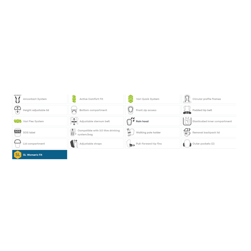 Aircontact žygių kuprinė yra pelniusi „nenugalimos“ titulą. Todėl atlikome tik nedidelius pakeitimus: ji išlieka itin patvari, tačiau dabar dar estetiškesnė, modernesnė ir funkcionalesnė. Ir dar patogesnė: dėl naujų, elastingų Active Fit petnešų bei atnaujinto juosmens diržo kuprinė idealiai prisitaiko prie naudotojo – užtikrinant gerokai didesnį komfortą. Moterims skirta sistema papildyta patikrintomis SL fit funkcijomis.